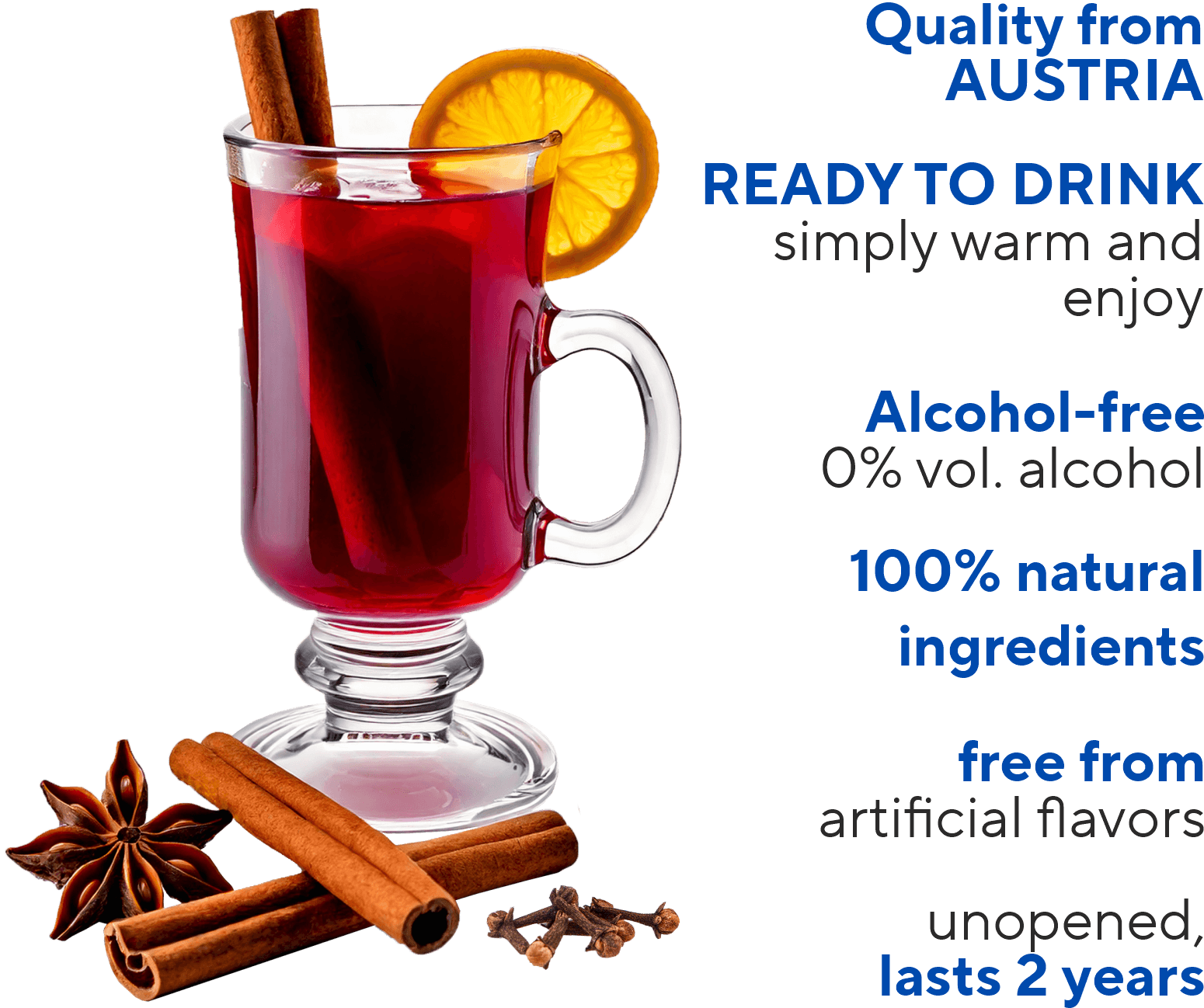 Natural flavors, winter delight: Our non-alcoholic mulled wine indulges the senses. Made from rich red grape juice, blended with mulled wine spices, it tastes like traditional mulled wine, only without the alcohol.
