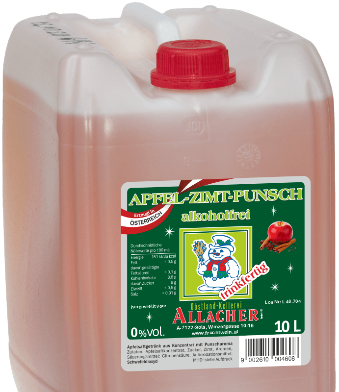 Apfelsaftgetränk aus Konzentrat mit Punscharoma, Zutaten: Apfelsaftkonzentrat, Zucker, Zimt, Aromen, Säuerungsmittel: Citronensäure, Antioxidationsmittel: Schwefeldioxyd